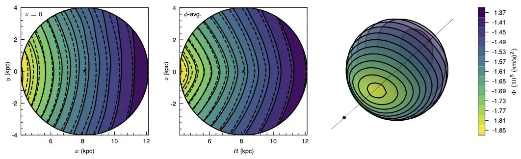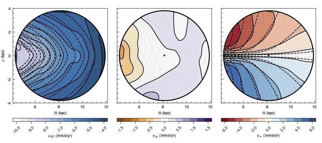 Our data is a set of stars within 4 kpc of the Sun. Further away, Gaia has difficulty measuring the distance to the stars and the velocity of the stars across the sky. So our measurement of the gravity of the Milky Way is restricted to this sphere, which stretches halfway to the Galactic Center (8.1 kpc away), and significantly above and below the stellar disk (which is about 1 kpc thick). But within that sphere, we have a continuous function (parametrized by a neural network) which is capable of evaluating the potential, acceleration, and density at every location. That is, I think, the first time this has been done.