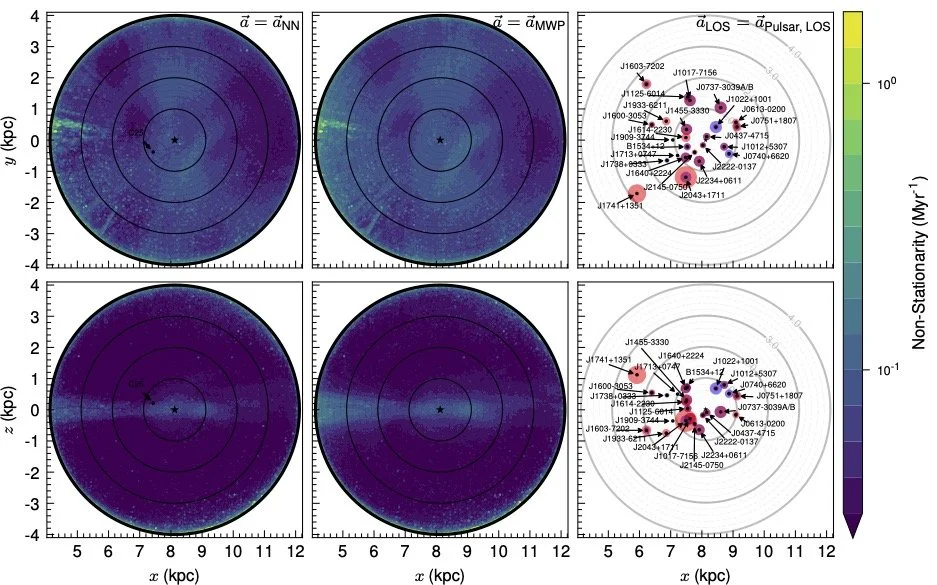 Comparing our accelerations to the pulsar line-of-sight accelerations, we find good but not exact agreement. However, we don’t see any obvious pattern of disagreement which would be suggestive of some unexpected localized gravitational source (that is, something other than the expected dark matter within the Milky Way). We can also use a “non-stationary” metric, which quantifies whether our CBE solution is actually zero. Larger values of this metric say we’re not getting self-consistent answers from the networks. We can do this in two ways, either using “our” accelerations (the result of the network) or the accelerations from the pulsar measurements. In either case, we see suggestions of disequilibrium due to dust towards the Galactic Center. However, there are also signs of larger-than-expected non-stationarity within the disk near us, in regions that are not obviously dust-dominated. This requires more study; some of this is likely that the stars are themselves not in equilibrium due to processes of star formation and evolution within the disk, but some of it may be due to interesting substructure.